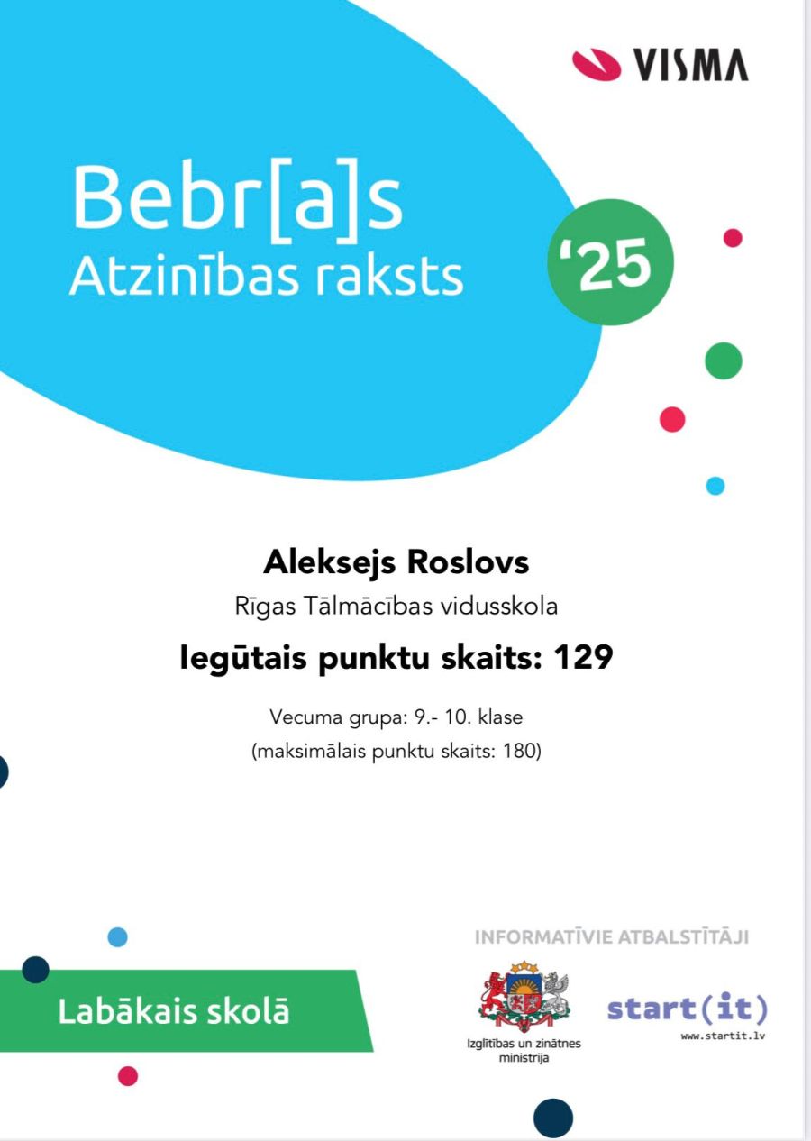 Lepojamies ar mūsu audzēkni Alekseju Roslovu, kas piedalījās ikgadējā Bebr[a]s starptautiskajā loģiskās un algoritmiskās domāšanas konkursā un ieguva atzinību. Starptautiskais informātikas un algoritmiskās domāšanas konkurss “Bebr[a]s” ir pasaulē lielākais informātikas un loģiskās domāšanas izaicinājums. Ik gadu konkursā piedalās vairāki miljoni skolēnu no nu jau no vairāk nekā 70 pasaules valstīm.