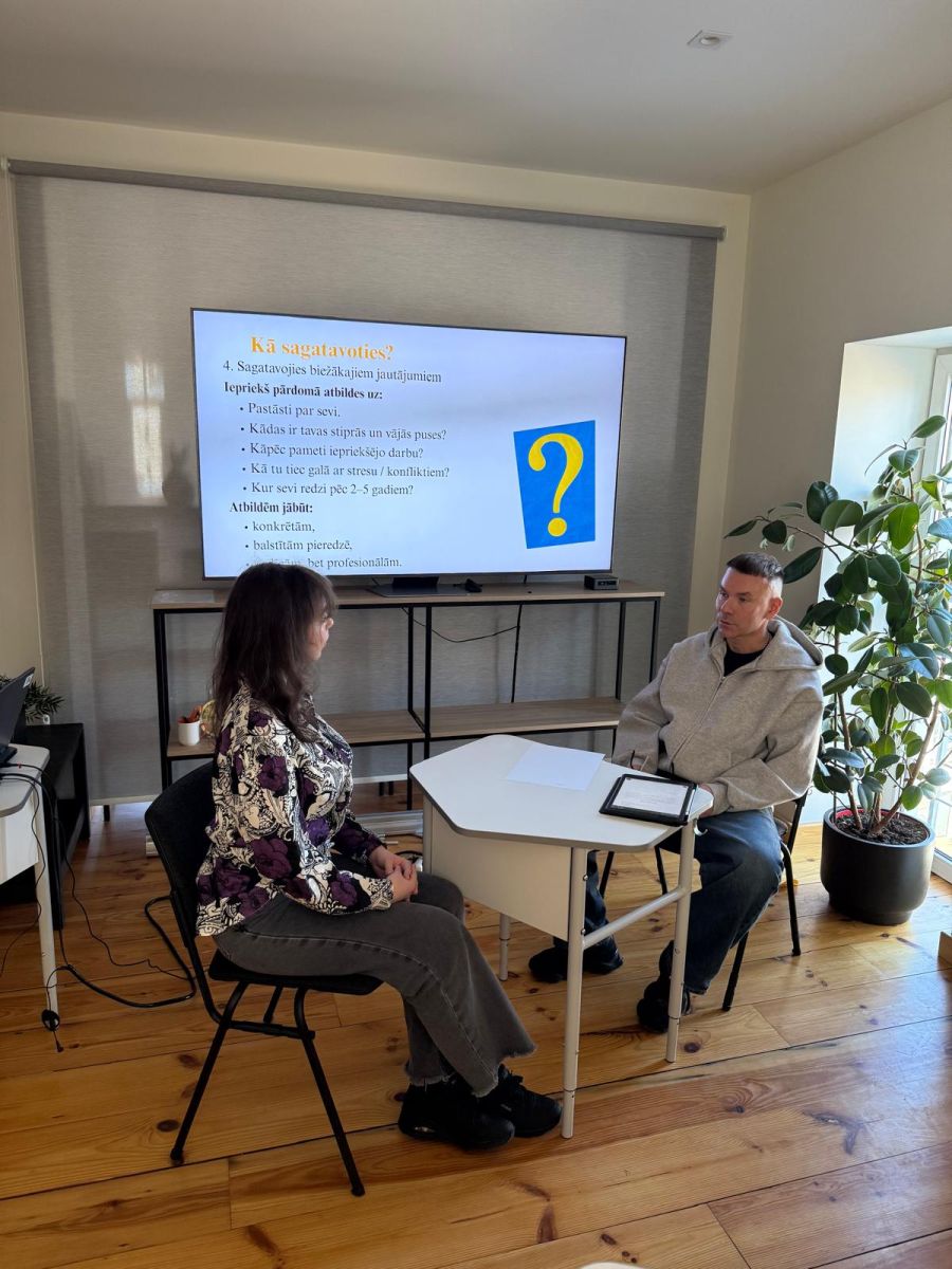 Aizvadījām klātienes praktisko darbnīcu “CV, motivācijas vēstule un darba intervijas simulācija”. 💼 To vadīja skolas karjeras konsultante Ligita Millere un psihologs Raimonds Auziņš.