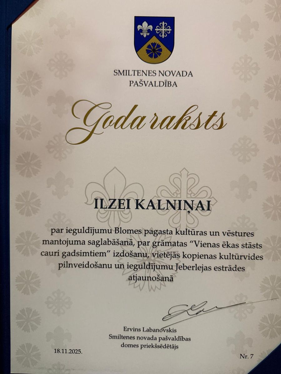 Latvijas proklamēšanas dienas vakarā mūsu skolas dibinātāja Ilze Kalniņa saņēma Goda rakstu no Smiltenes novada par ieguldījumu Blomes pagasta kultūras un vēstures mantojuma saglabāšanā, par grāmatas "Vienas ēkas stāsts cauri gadsimtiem" izdošanu, vietējās kopienas kultūrvides pilnveidošanu un ieguldījumu Jeberlejas estrādes atjaunošanā. 🧡