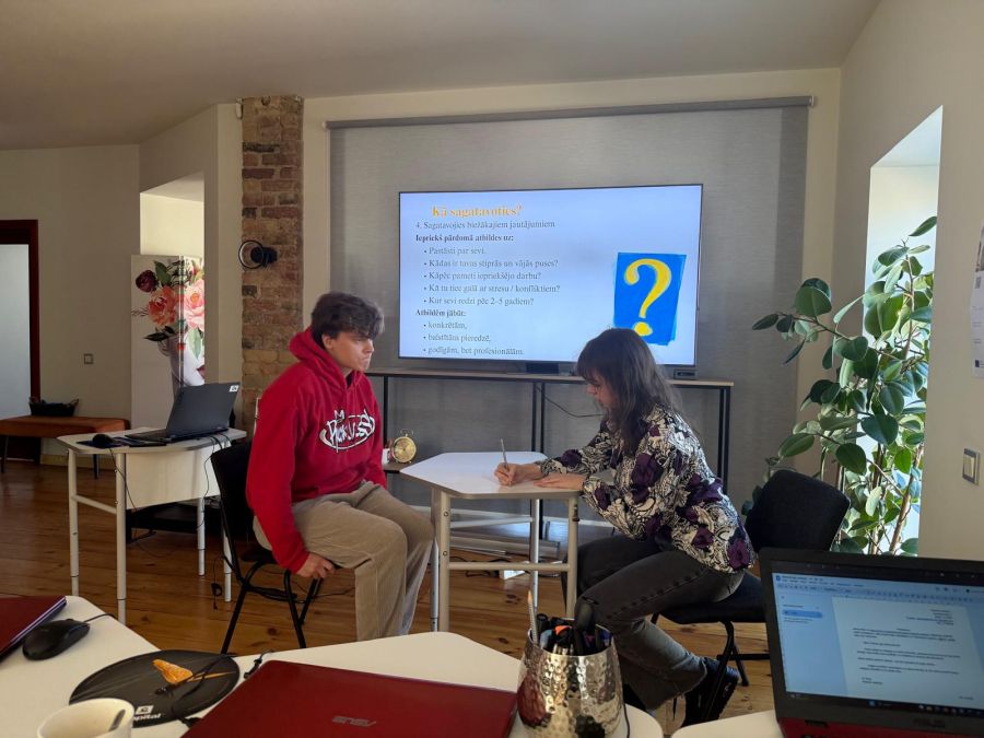 Aizvadījām klātienes praktisko darbnīcu “CV, motivācijas vēstule un darba intervijas simulācija”. 💼 To vadīja skolas karjeras konsultante Ligita Millere un psihologs Raimonds Auziņš.